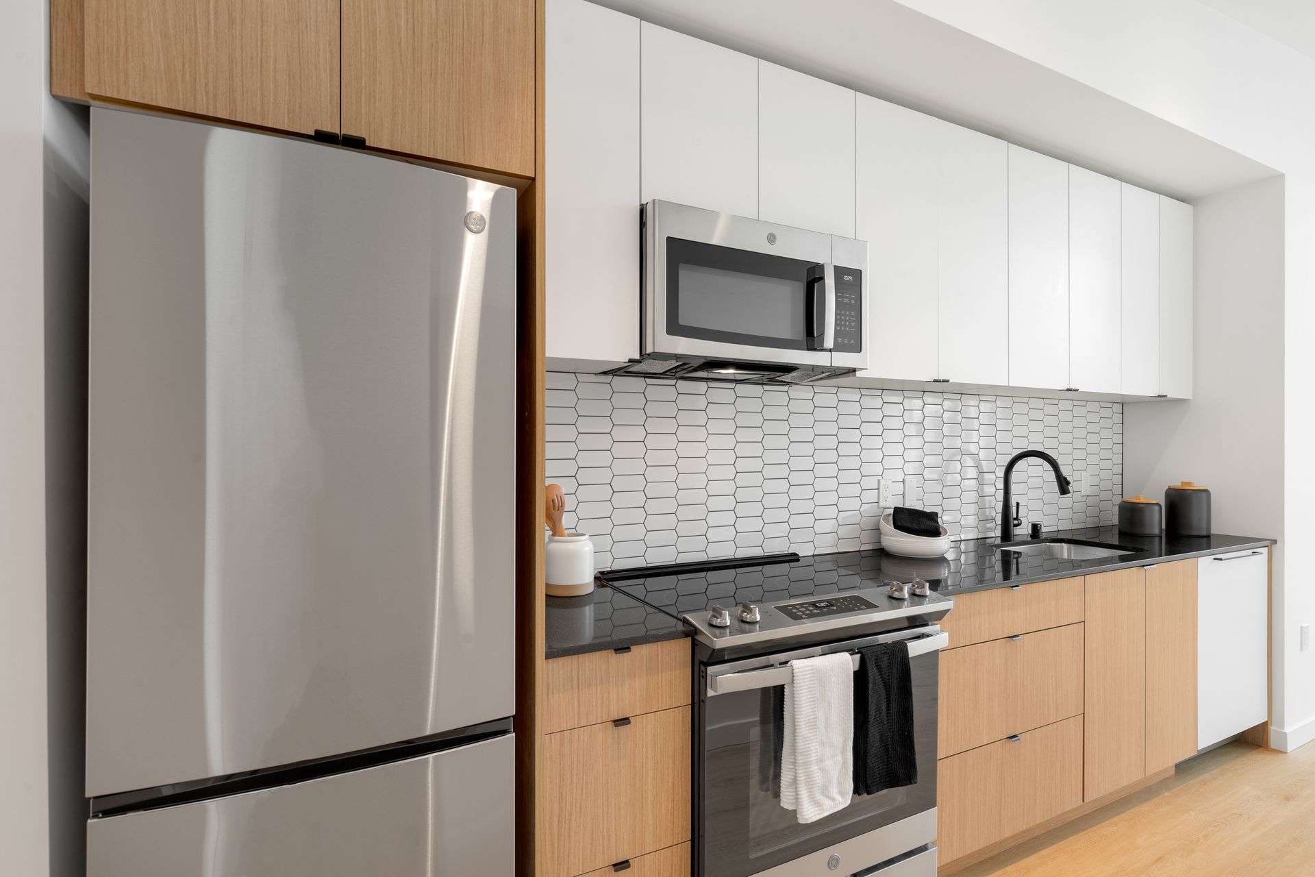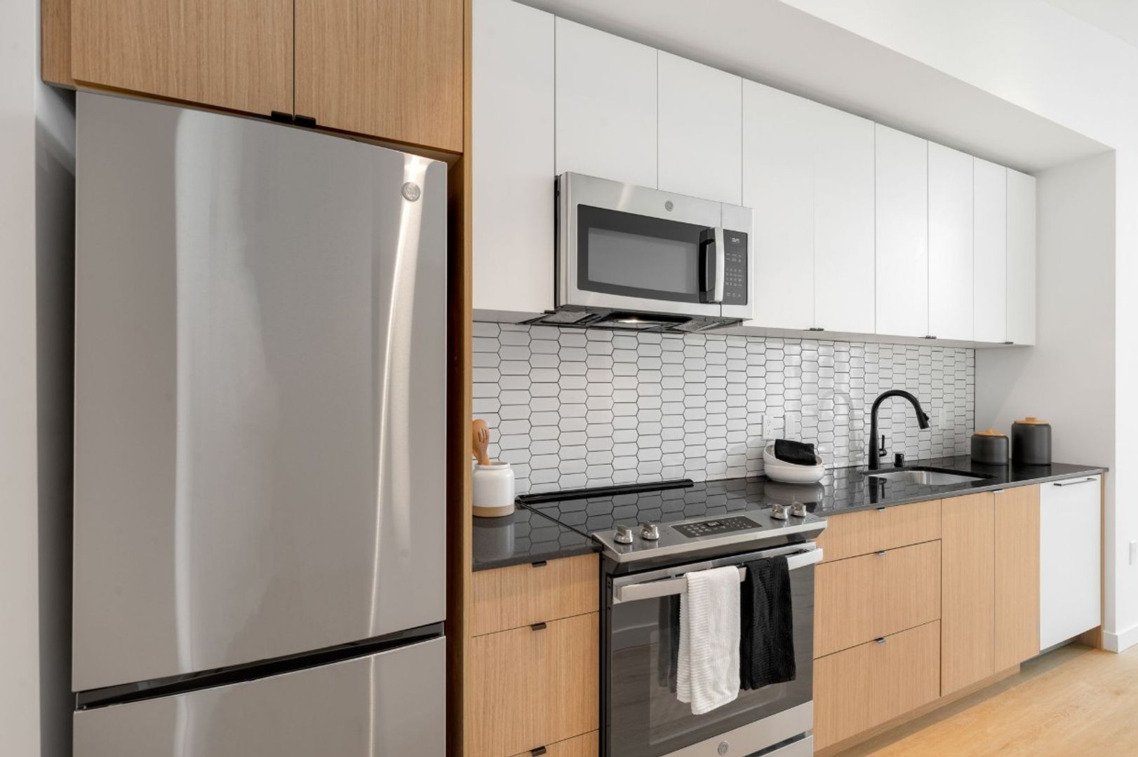 The building itself is only about a year old, so the home still feels nearly brand new. Inside, you’ll find a stylish open layout with hardwood flooring throughout, a modern kitchen with premium cabinetry, quartz countertops, and top-of-the-line stainless steel appliances. The open design maximizes space while maintaining a clean, contemporary feel.